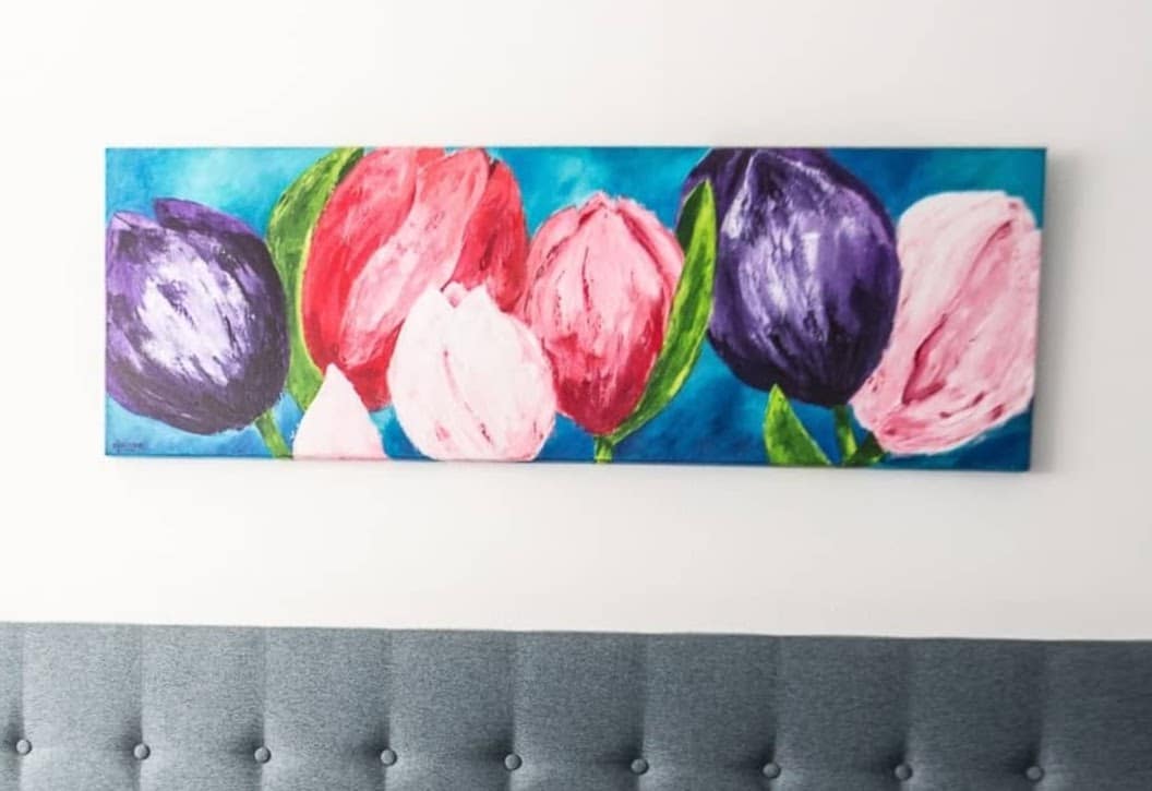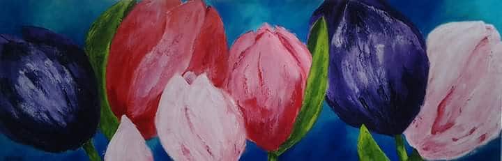 Wat is er gezelliger dan een vrolijk bosje bloemen in huis? Precies, niet veel, dit is de reden waarom ik graag bloemen op het doek zet. Heb ik een favoriet? Dat zeker. De tulp.
